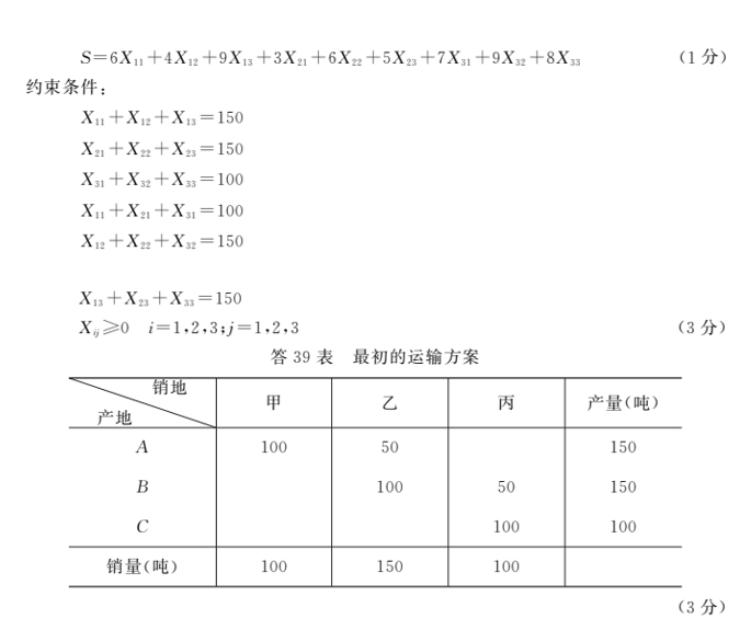 已知某商品由产地A、B、C生产,并运往甲、乙、丙 销地出售,产量、销量及单位运价如题39表。要求使总的运输成本最小,写出该运输问题的数学模型,并用西 北 角 法 求其 最初运输方案及相应的总运输费用。