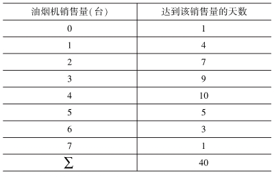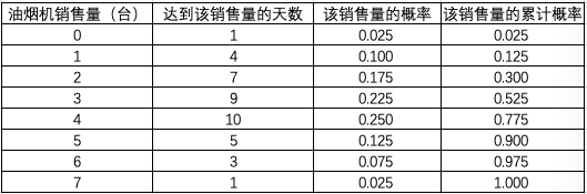 已知某品牌油烟机在某区域过去40天内销售记录如题表,试求每种可能的销售量的概率,并求出累计概率。