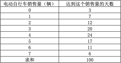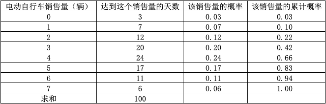 已知某款电动自行车在某城市过去100天内销售记录如下表,试求每种可能的销售量值的概率,并求出累计概率。