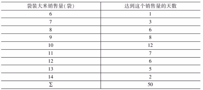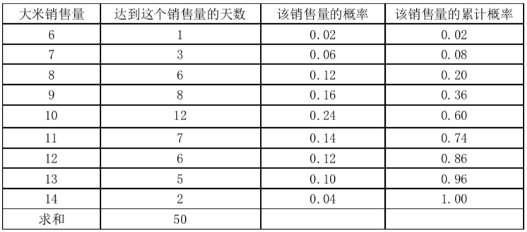 已知某品牌袋装大米在某区域过去50天内销售记录如下表,试求每种可能的销售量值的概率,并求出累计概率。