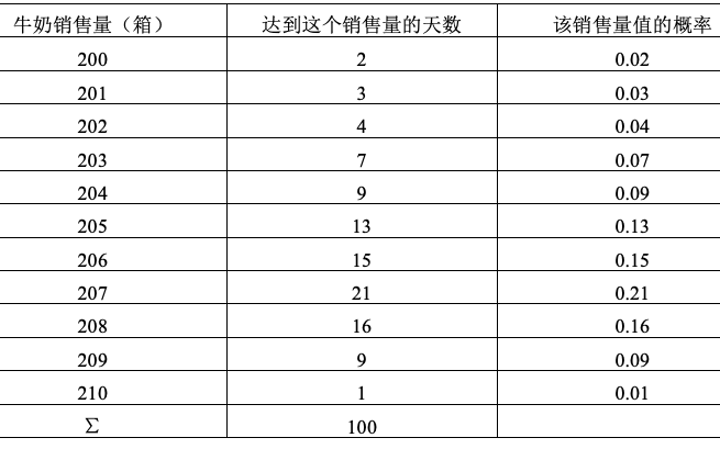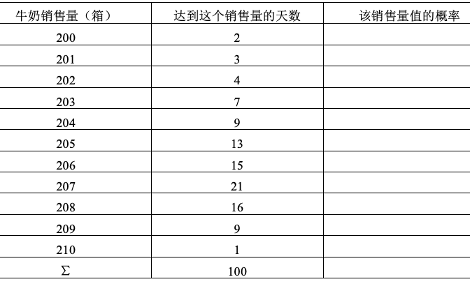 某牛奶销售公司收集了过去每天的销售记录列于下表,销售记录表明,该公司销售量随机变动在每天销售200到210箱之间。试确定每种可能的销售量值的概率填在下表中,并画出销售量的概率分布图。