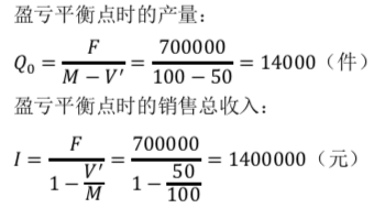 某公司生产一种产品的固定成本为40万元,现考虑今年扩大生产规模,固定成本将增加30万元,已知产品单件可变成本为50元,售价100元,求企业扩大规模后新的盈亏平衡点处的产量及盈亏平衡点时的销售总收入。