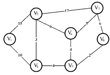 电信公司准备在甲、乙两地之间沿公路架设光缆,下图给出了两地间的公路交通图,其中,V1表示甲地,V7表示乙地,点与点之间的连线(边)表示公路,边上的数值表示两地间公路长度(km)。问如何选择架设线路可使光缆架设距离为最短?最短距离是多少?