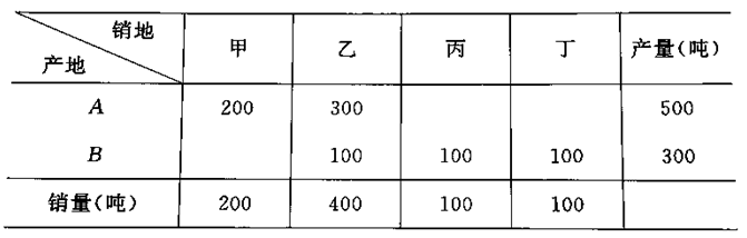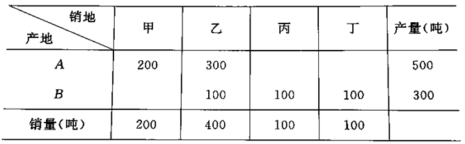 已知某商品由产地 A 、 B 生产,并运往甲、乙、丙、丁销地出售,产量、销量及单位运价如表所示。要求使总的运输成本最小,写出该运输问题的数学模型,并用西北角法求其最初运输方案及相应的总运输费用。