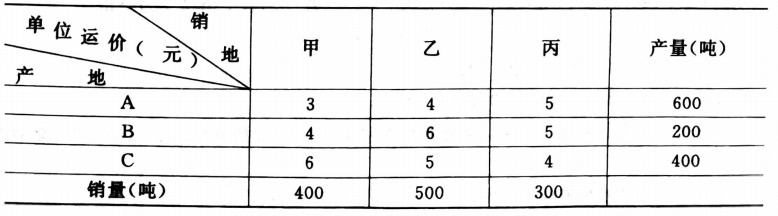 已知某商品由产地A、B、C生产,并运往甲、乙、丙销地出售,产量、销量及单位运价如下表,试用西北角法求其最初运输方案及相应的总运输费用。