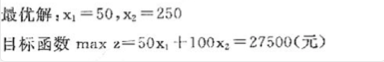 根据约束条件求得目标函数的可行解区,根据线性规划的基本原理,最优解必然出现在可行解区边缘折线的凸交点上,通过计算得,目标函数在点(50,250)处取最大值,求得最大利润为50×50+100×250=27500元。