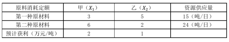 某公司生产甲、乙两种产品(吨),这两种产品均需要使用两种关键材料进行加工,资源限量与可获利润数据如下表。为获得利润最大化,该企业每日应如何安排两种产品的生产?