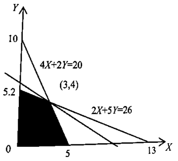 约束条件:2X+5Y≤26,4X+2Y≤20,X≥0,Y≥0