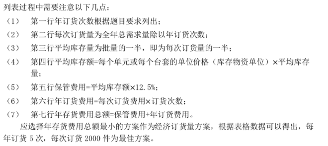 某厂生产产品需要一种标准件,年需求量10000件,每件价格1元,每次采购费用25元,年保管费用率为平均库存额的12.5%,要求列表计算出每年订货1、2、4、5、10、20次的各项费用,并根据表格确定经济订货量和最小库存费用。(结果保留整数)