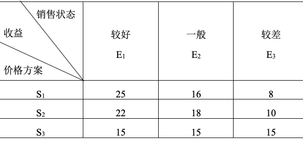 某音像公司出版某歌星的一张新唱片。拟定三种价格方案,估计有三种销售状态,其收益预测列表(单位:万元)如下: