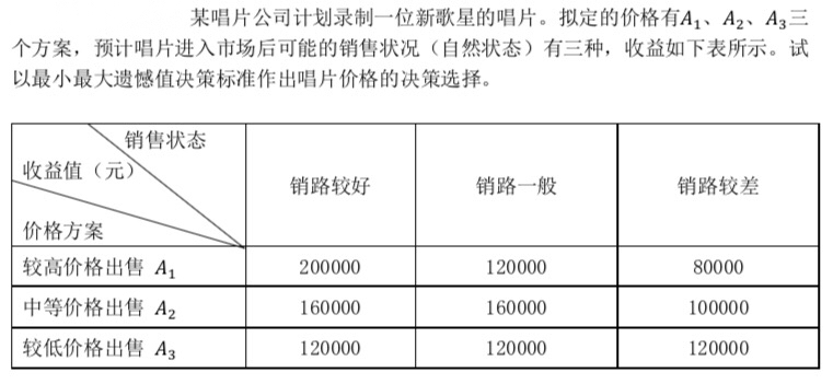 最小最大遗憾值决策标准:将每种状态下的最大收益值减去其它方案的值,找出每个方案的最大遗憾值,然后从中选择一个最小的作为备选方案。