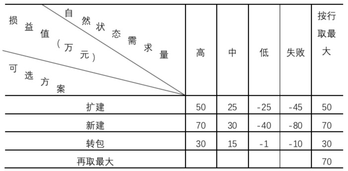(2)再从这些最大收益值所代表的不同方案中,选择一个收益值最大的方案作为备选方案:max{50、70、30}=70