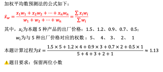 某乡镇企业试制成功一种5号电池,为了确定出厂价格,该企业调研了市场上5种同类产品出厂价格如下:1.5、1.2、0.9、0.7、0.5(元/节),该厂对它们设定了相应的权数为:5、4、3、2、1,试依据加权平均数预测法,计算该种电池的出厂价格预测值。(结果保留两位小数)