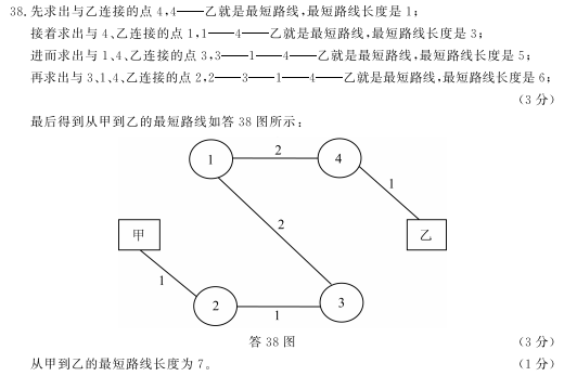 某旅行者要从甲地开车自驾游到乙地,中间可穿行的市镇与行车道路网络如题38图所示。试求从甲地到乙地的最短路线长度并画出最短路线图。 作者:高老师 时间:2024-07-27 浏览 1 某旅行者要从甲地开车自驾游到乙地,中间可穿行的市镇与行车道路网络如题38图所示。试求从甲地到乙地的最短路线长度并画出最短路线图。【正确答案】:答案如图 📱 扫码体验刷题小程序 扫一扫使用我们的微信小程序