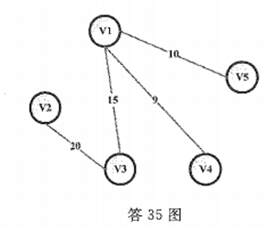 已知连接5个城镇的公路交通图如题35图,要沿公路架设5个城镇的光缆线,并要求光缆线架设的总长度为最小,试以最小枝杈树方法求出最优方案并计算光缆线的总长度。