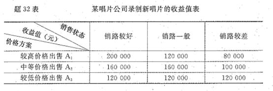 某唱片公司计划录制一位新歌星的唱片,定的价格有A1、A2、A3三个方案,预计唱片进入市场后可能的销售状况(自然状态)也有三种,收益表如题32表。试以最小最大遗憾值决策标准作出唱片价格的决策选择