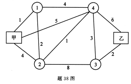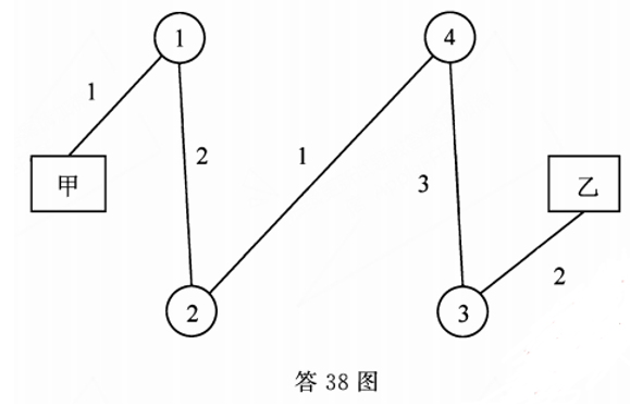 某旅行者要从甲地开车自驾游到乙地,中间可穿行的市镇与行车路线网络如题38图所示。试求出从甲地到乙地的最短路线长度并画出最短路线图。