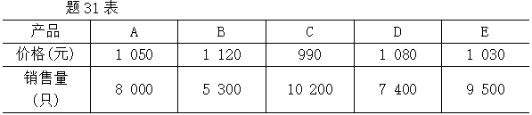 某手机制造商推出一款新型手机,通过市场调研,发现功能相近的5种其他品牌手机的价格和销售量如题31表: