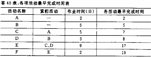 在你为题39所绘制的网络图中标出各结点时间参数,确定关键路线并用双线(或粗黑线)表示,计算总工期及各项活动最早完成时间(直接填在 作者:高老师 时间:2024-07-27 浏览 11 在你为题39所绘制的网络图中标出各结点时间参数,确定关键路线并用双线(或粗黑线)表示,计算总工期及各项活动最早完成时间(直接填在题39表中相应空栏处)。【正确答案】:在答39图上标出各节点时间参数。关键路线B,D,E,F。总工期19天。 📱 扫码体验刷题小程序 扫一扫使用我们的微信小程序