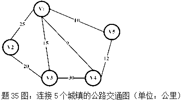 已知连接5个城镇的公路交通图如题35图。为了沿公路架设5个城镇的光缆线,并要求光缆线架设的总长度为最小,试以最小枝杈树方法求出最优方案并计算光缆线的总长度。