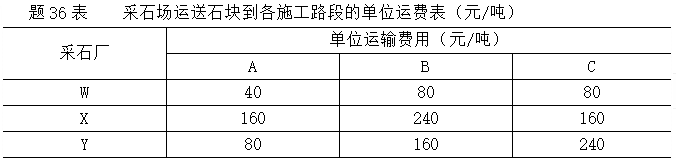 某采石公司有三个采石场W、X、Y,各场每周采石能力分别为56吨、82吨和77吨。该采石公司已与某路桥公司签订了每周供应石块的协议,路桥公司现有三个施工路段A、B、C,每周对石块的需求量分别为72吨、102吨和41吨。采石场运送石块到各施工路段的单位运费如题36表。为选择最佳运输方案,试建立平衡的运输表并以西北角法求其最初的运输方案。