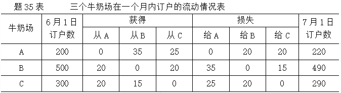 某居民小区的牛奶全部由A、B、C三个牛奶场供应,题35表是三个牛奶场在一个月的观察期内订户的流动情况,假定在此期间既无老订户退出,也没有新订户加入。试计算三个牛奶场的转移概率矩阵(结果保留三位小数)。