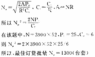 某公司平均每周需求某配件3900台套,每台套存贮一年费用为6元,每次订货费25元,试求该公司年度最佳订货批量和全年最佳订货次数。 作者:高老师 时间:2024-07-27 浏览 2 某公司平均每周需求某配件3900台套,每台套存贮一年费用为6元,每次订货费25元,试求该公司年度最佳订货批量和全年最佳订货次数。(每年按52周计算)【正确答案】:今年最佳订货次数= 3900×52/1300= 156(次) 📱 扫码体验刷题小程序 扫一扫使用我们的微信小程序