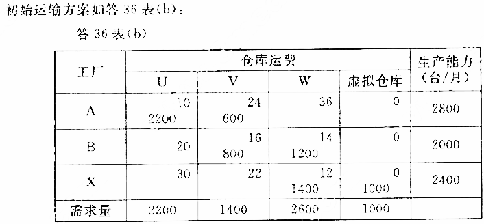 某公司现有位于不同城市的两个工厂A、B和3个仓库U、V、W。考虑公司的发展,公司决定在X城新建一个工厂,各厂生产能力、仓库需求及工厂到仓库的单位运费如题35表。