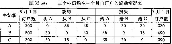 某居民小区的牛奶全部由A、B、C三个牛奶场供应,题35表是三个牛奶场在一个月的观察期内订户的流动情况,假定在此期间既无老订户退出,也没有新订户加入。试计算三个牛奶场的转移概率矩阵。