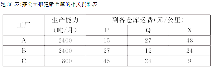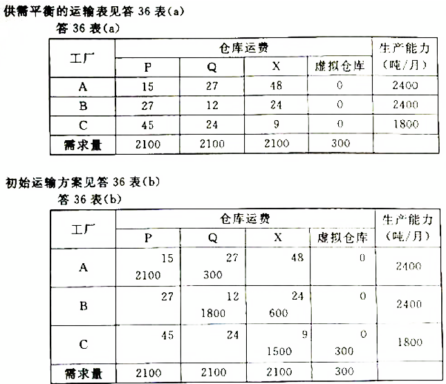 某公司现有3个工厂A、B、C,它们分布在3个不同的城市;有2个仓库P、Q,也位于不同的城市,仓库用于存放工厂生产的产品,随时供应用户,每个仓库每月需供应市场2100吨产品。为了更好地为用户服务,该公司决定再设置一个新仓库。经过调查研究和估点法评价,确定X城可建仓库,仓库容量仍为2100吨,相关资料见题36表。试建立供需平衡的运输表,并以西北角法求其最初的运输方案。