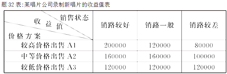 某唱片公司计划录制一位新歌星的唱片。拟定的价格有A1、A2、A3三个方案,预计唱片进入市场后可能的销售状态(自然状态)也有三种,收益表如题32表。试以最小最大遗憾值决策标准作出唱片价格的决策选择。