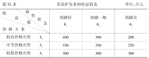 某企业计划生产某款护发素,拟定的价格有A1、A2、A3三个方案,预计进入市场后可能的销售状态有三种,收益表如题32表,试以最大最大决策标准作出该款护发素价格的决策选择。