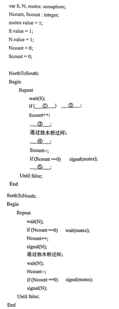 下面的代码用记录型信号量机制的wait操作和signal操作解决了由北向南和由南向北过河人的同步问题。要求将由北向南代码段中编号①-⑤处空缺的内容填写在答题卡上。