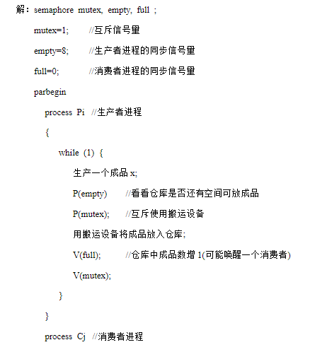 假设有一个成品仓库,总共能存放8台成品,生产者进程生产产品放人仓库,消费者进程从仓库中取出成品消费。为了防止积压,仓库满的时候就 作者:高老师 时间:2024-07-27 浏览 2 假设有一个成品仓库,总共能存放8台成品,生产者进程生产产品放人仓库,消费者进程从仓库中取出成品消费。为了防止积压,仓库满的时候就停止生产。由于仓库搬运设备只有一套,故成品的存入和取出只能分别执行,使用P、V操作来实现该方案。【正确答案】:【题目解析】:考点:P、V操作 📱 扫码体验刷题小程序 扫一扫使用我们的微信小程序