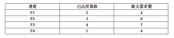 设有12个同类资源可供4个进程共享,进程对资源的需求量及资源分配情况如下: