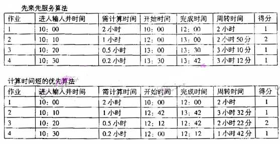 一个多道程序系统,有一个作业序列,作业的提交时间及运行时间在下表中所列。当第一个作业进入系统后开始调度,假定作业都是仅作计算。请列出在分别采用先来先服务算法和计算时间短的优先算法管理作业时各个作业的开始时间、完成时间和周转时间。注意:忽略系统开销。