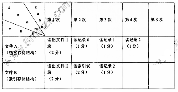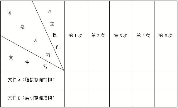 在一个采用一级目录结构的文件系统中,文件A采用链接存储结构,文件B采用索引存储结构,它们的每个记录都占用一个物理块。如果它们都要读出第2个记录(记录的编号从0开始。假设只需一次读盘就可读出文件目录或索引表。),请通过填写下列表格,分别说明在这两个文件中读出所需记录的过程,即给出每次读盘读出的内容。(注:如果格子尚未填满,操作就已完成,则后续格子留空)。