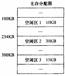 某系统采用动态分区存储管理技术。某时刻在内存中有三个空闲区,这三个空闲区的首地址和大小分别是:空闲区1(100KB、10KB),空闲区2(234KB、30KB),空闲区3(300KB、15KB);主存分配如题47图所示。现有如下作业序列:作业1要求15KB,作业2要求16KB,作业3要求10KB。要求: