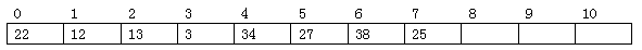 长度为11的散列表,其散列函数为H(key) =key mod 11,求出键值序列(3,12,13,27,34,22,38,25)对应的散列函数H(key) :