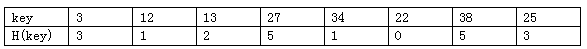 设散列表长度为11,散列函数H(key)=key mod 11(mod为求余运算),给定的键值序列为:(3,12,13,27,34,22,38,25)。
