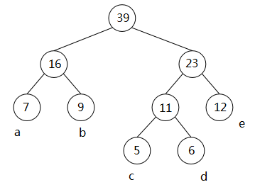 假设某个电文由5个字母a, b, c,d,e组成,每个字母在电文中出现的次数为7, 9, 5, 6, 12。