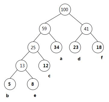 (3)从F中删去5、8,并将13加入F。此时F= {34, 13, 12, 23, 18}。此时F中仍多于一棵二叉树,则返回(2)。F的变化过程为{34,25, 23, 18},{34,25,41},{59,41},{100}。直到F中只含一棵二叉树为止,这棵二叉树就是哈夫曼树。如下图:
