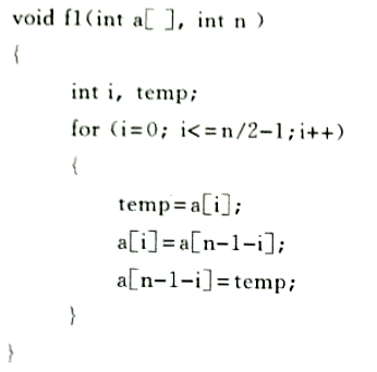 思路:假设100个整数读入到数组a中, 算法f1的思想是分别从数组两端依次将对应数进行交换,即a[i]与a[100-1-i]进行相互交换,i=0〜49。先将第i个元素赋值给临时变量temp,然后将第n-1-i个元素赋值给第i个元素,最后将temp中的值赋值给第n-1-i个元素,下一次逆置第i+1个元素,共执行n/2次。