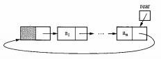 如图,尾指针rear指向单链表的第一个结点,即头结点;头结点又指向表首结点。