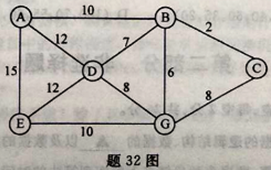 如题32图所示为一个地区的交通网,顶点表示城市,边表示连接城市间的公路,边上的权值表示修建公路需花费的造价。现在需要选择能够连通每个城市且总造价最省的5条公路,请画出修建公路的方案,并给出该工程的总造价。