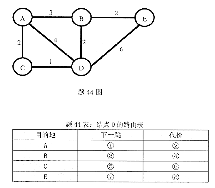 设网络拓扑如题44图所示。请利用Dijkstra最短路径算法计算节点D到网络中所有节点的最短路径,按题44表中的序号写出计算结果 作者:高老师 时间:2024-07-27 浏览 2 设网络拓扑如题44图所示。请利用Dijkstra最短路径算法计算节点D到网络中所有节点的最短路径,按题44表中的序号写出计算结果。【正确答案】:①C ②3 ③B ④2 ⑤C ⑥1 ⑦B ⑧4【评分说明】每项 1.5 分,共 12 分。 📱 扫码体验刷题小程序 扫一扫使用我们的微信小程序