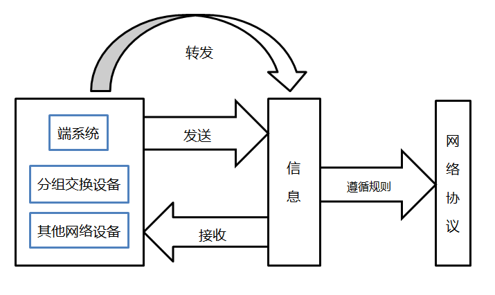 端(端系统)、换(分组交换设备)、其他设备进行发(发送)接(接收)转(转发)过程中需要遵循的规则即为网络协议。