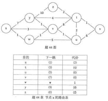 (12分)设网络拓扑如题44图所示。请利用Dijkstra最短路径算法计算节点x到网络中所有节点的最短路径,填写题44表中序号处的内容。 注:如果某个节点在选择下-跳节点时,有多个节点的最短路径相同,则选择节点编号小的节点作为下一跳节点。例如,如果节点x到节点y和节点z的路径代价相同,而且都是x到所有下一跳节点中的最短路径,则选择y为x的下一跳节点。