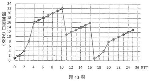 (13分)题43图是某个TCP连接(协议为TCP-Reno)的拥塞窗口随RTT的变化过程。请回答如下问题: (1)第1个RTT时的拥塞窗口阈值是多少? (2)说明该过程中哪些时间段为慢启动阶段? (3)说明该过程中哪些时间段为拥塞避免阶段? (4)第10个RTT时,发生了什么事件?拥塞窗口及其阈值大小如何变化? (5)第16个RTT时,发生了什么事件?拥塞窗口及其阈值大小如何变化?