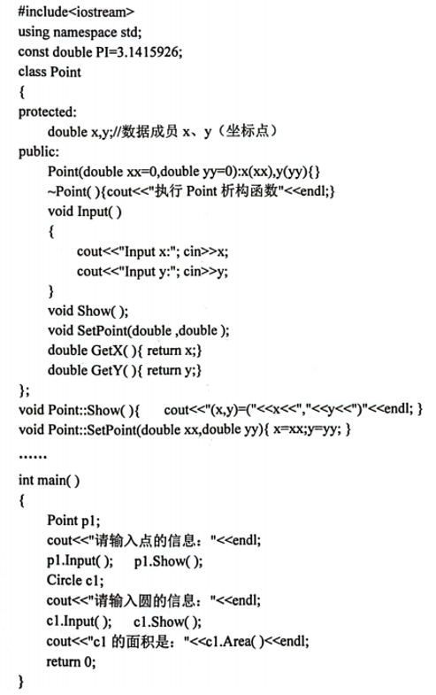 参考Point(点)类和主函数的信息,逐步完成派生类Circle(圆)的设计,要求: